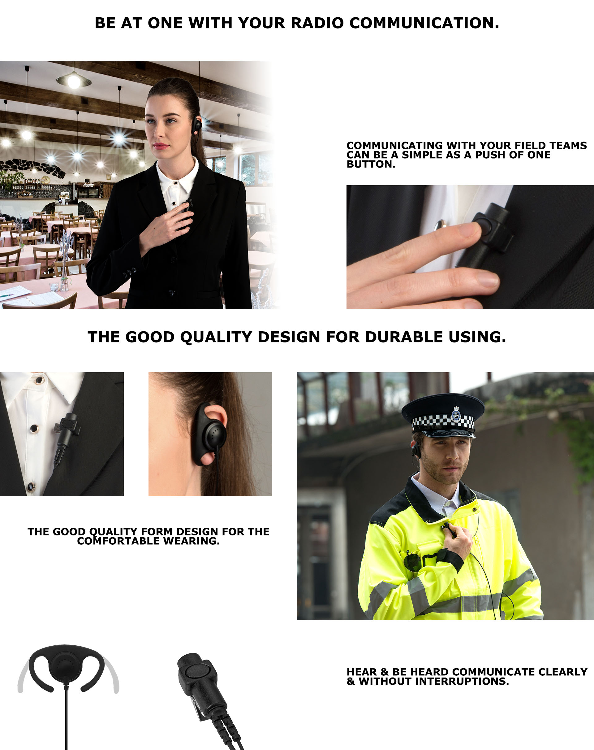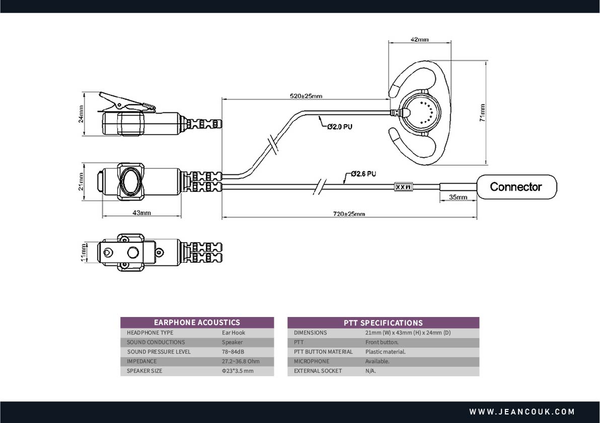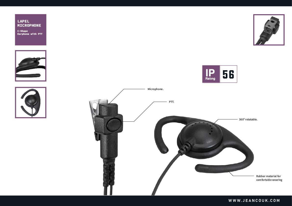 High-quality, adjustable earphone design to fit any ear and it provides clear & great audio. Combined with our E20 build-in ear-bone transducer makes a great solution for security and service applications.