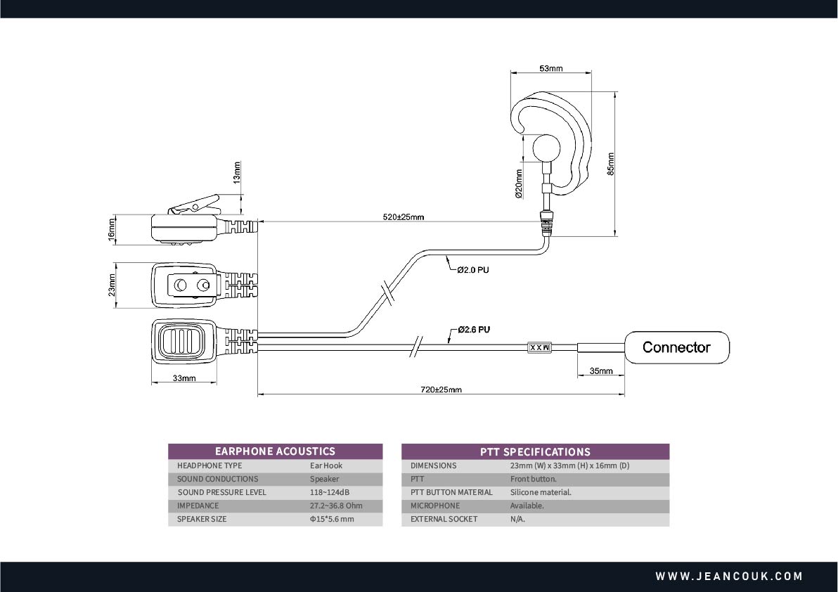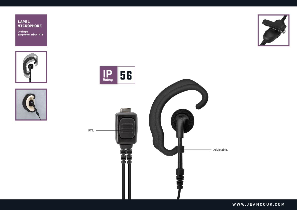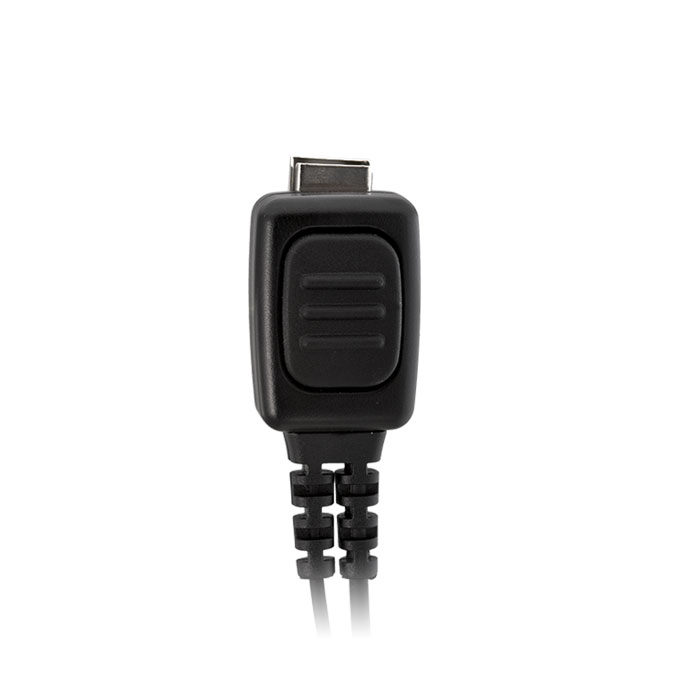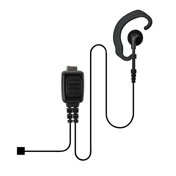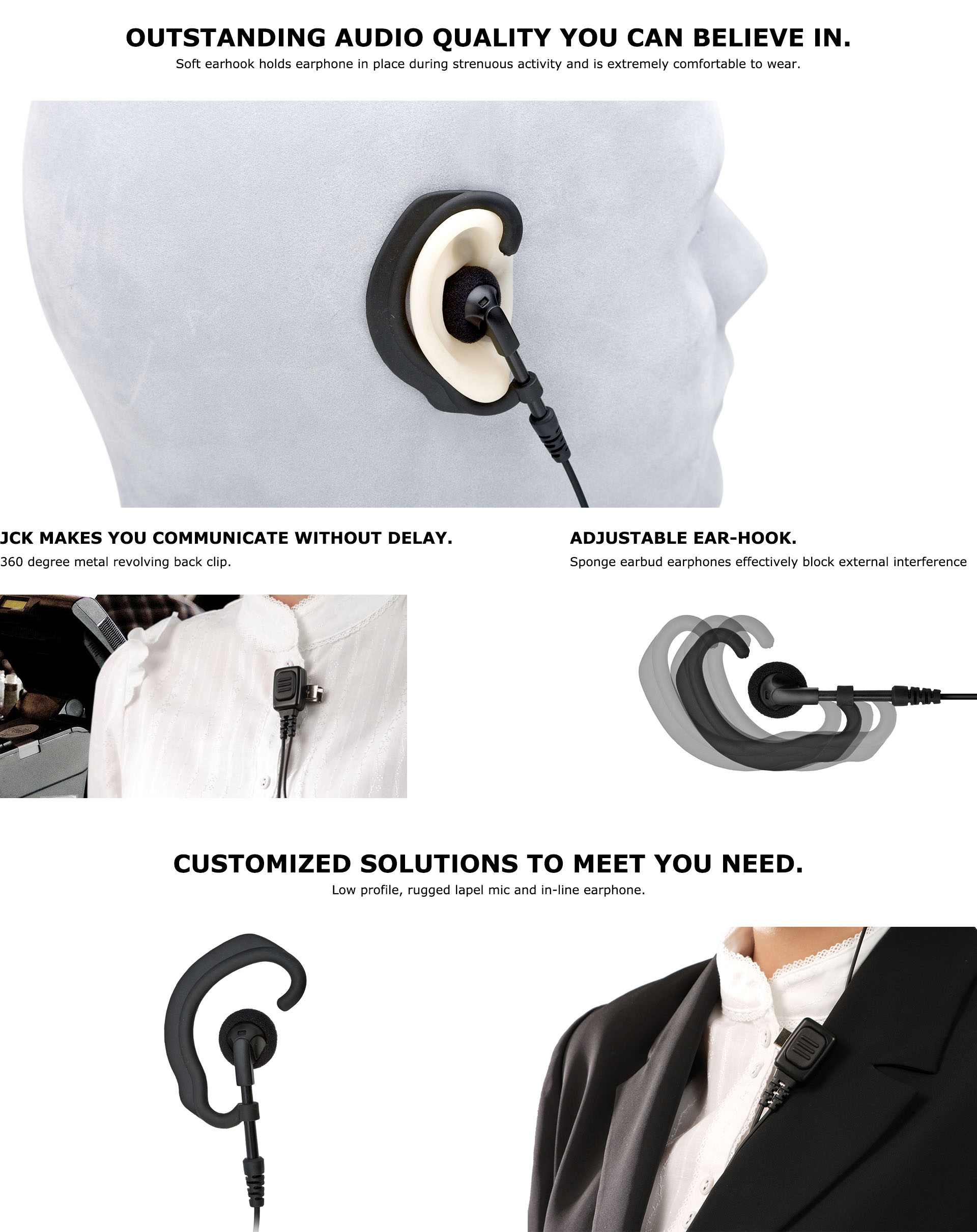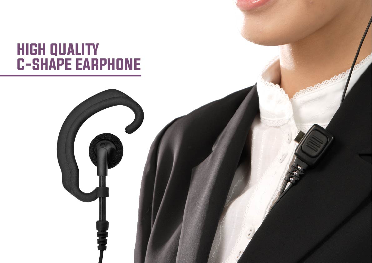 Small and comfortable C shape ear hook for long hours to use together with a small and high-quality Push-To-Talk. It offers a large & easily accessible Push-To-Talk rubber button & 360 degrees metal revolving back clip.